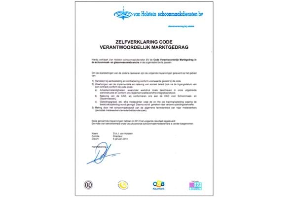 Middels deze code verklaart Van Holstein het sociale beleid te implementeren en na te leven conform de code. Onder andere de arbeidsomstandigheden, de naleving van de branche CAO en de opleidingsgraad van de medewerkers zijn hierin vastgelegd.